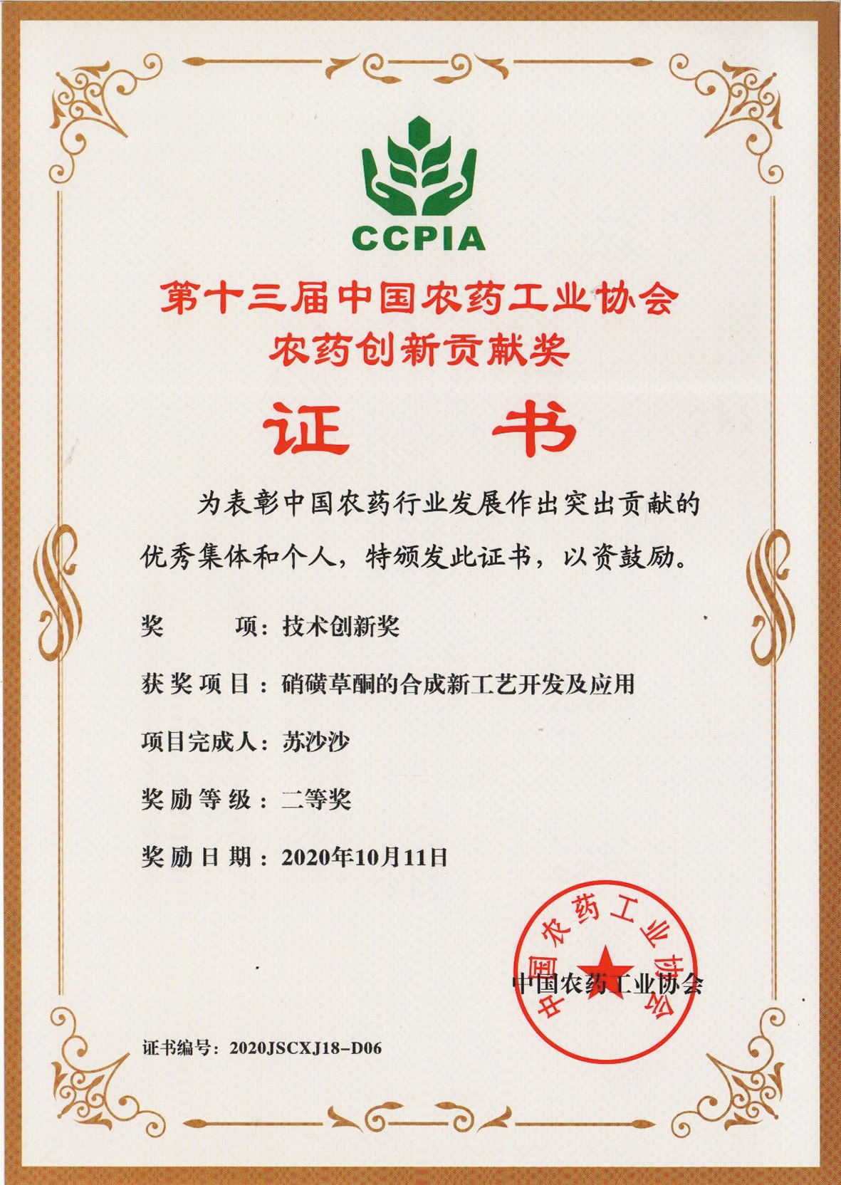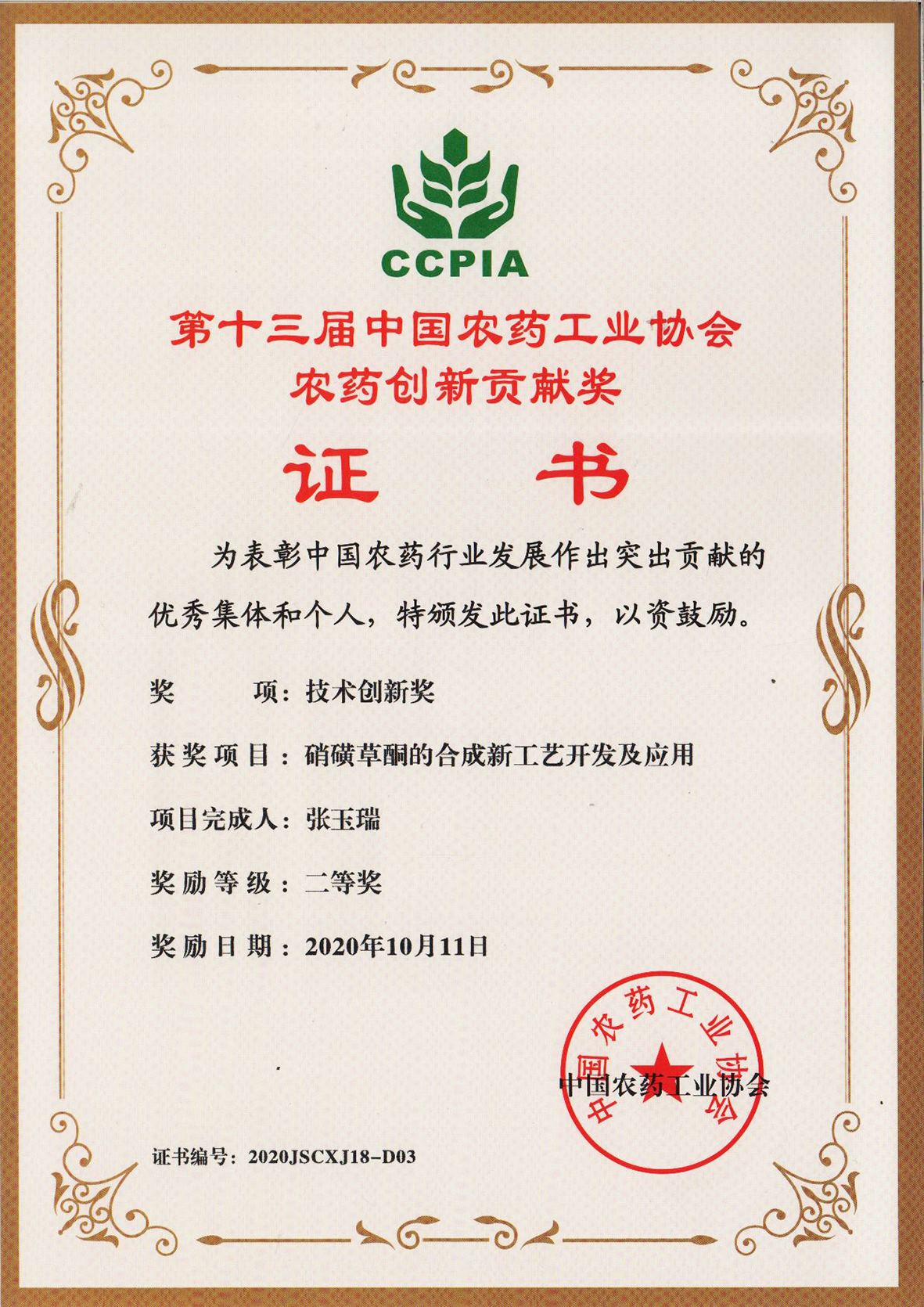 ■2020-11-05 我公司“硝磺草酮的合成新工藝開發(fā)及應(yīng)用”項(xiàng)目榮獲技術(shù)創(chuàng)新獎