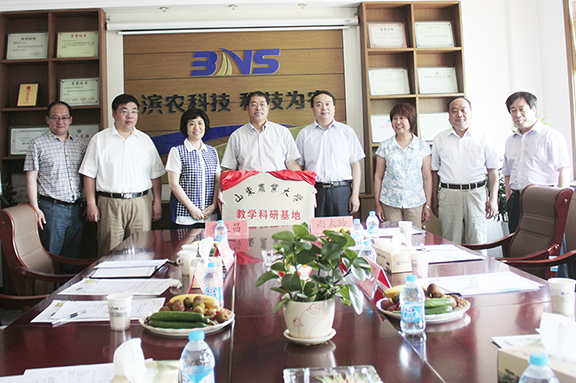5月30日,濱農(nóng)科技與山東農(nóng)業(yè)大學獎學金合作暨教學科研基地揭牌儀式在我公司二樓會議室舉行。山東農(nóng)業(yè)大學副校長車先禮、教務處副處長尚太玲、學工處副處長韓同吉、植保學院黨委書記董厚奎、植保學院副院長王金信、植保團委副書記王小東一行來我公司參觀交流并簽署合作協(xié)議。山農(nóng)教務處副處長尚太玲、我公司董事長黃延昌分別代表雙方簽署合作協(xié)議,濱州市政協(xié)副主席、民建濱州市委主委吳國瑞為科研基地揭牌。